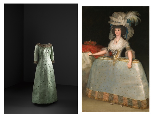 noche en satén verde claro con perlas y abalorios y el cuadro La reina María Luisa con tontillo, son